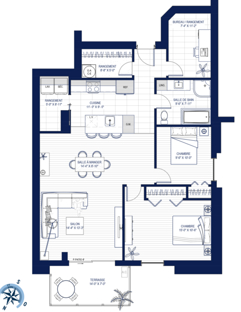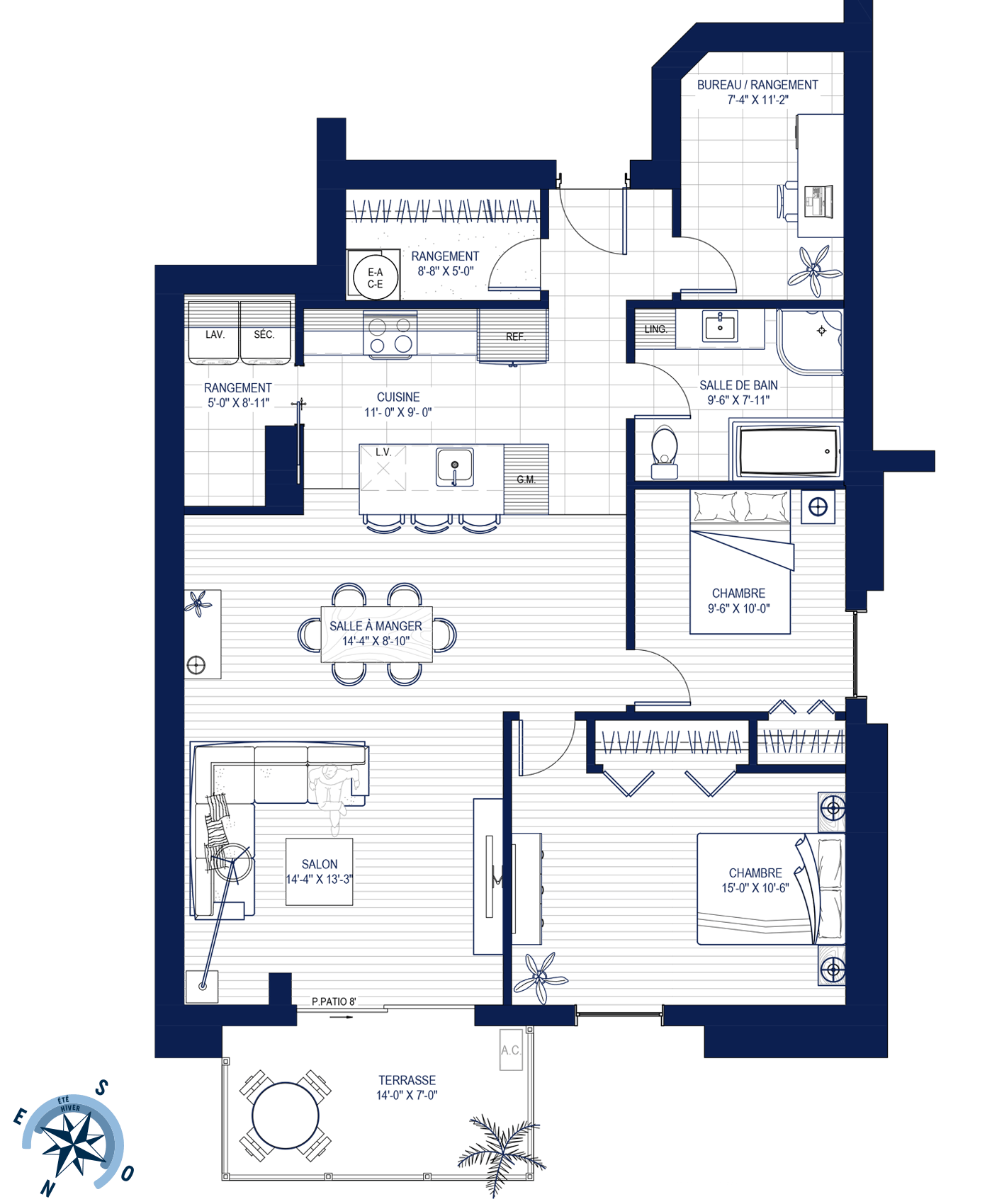 Design moderne et raffiné avec des plafonds de 9 pieds en béton brut au style industriel et douche en céramique.